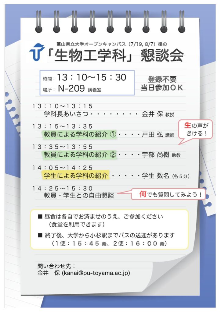 【7/19・8/7】オープンキャンパス後に「生物工学科」懇談会を開催します【高校生】
